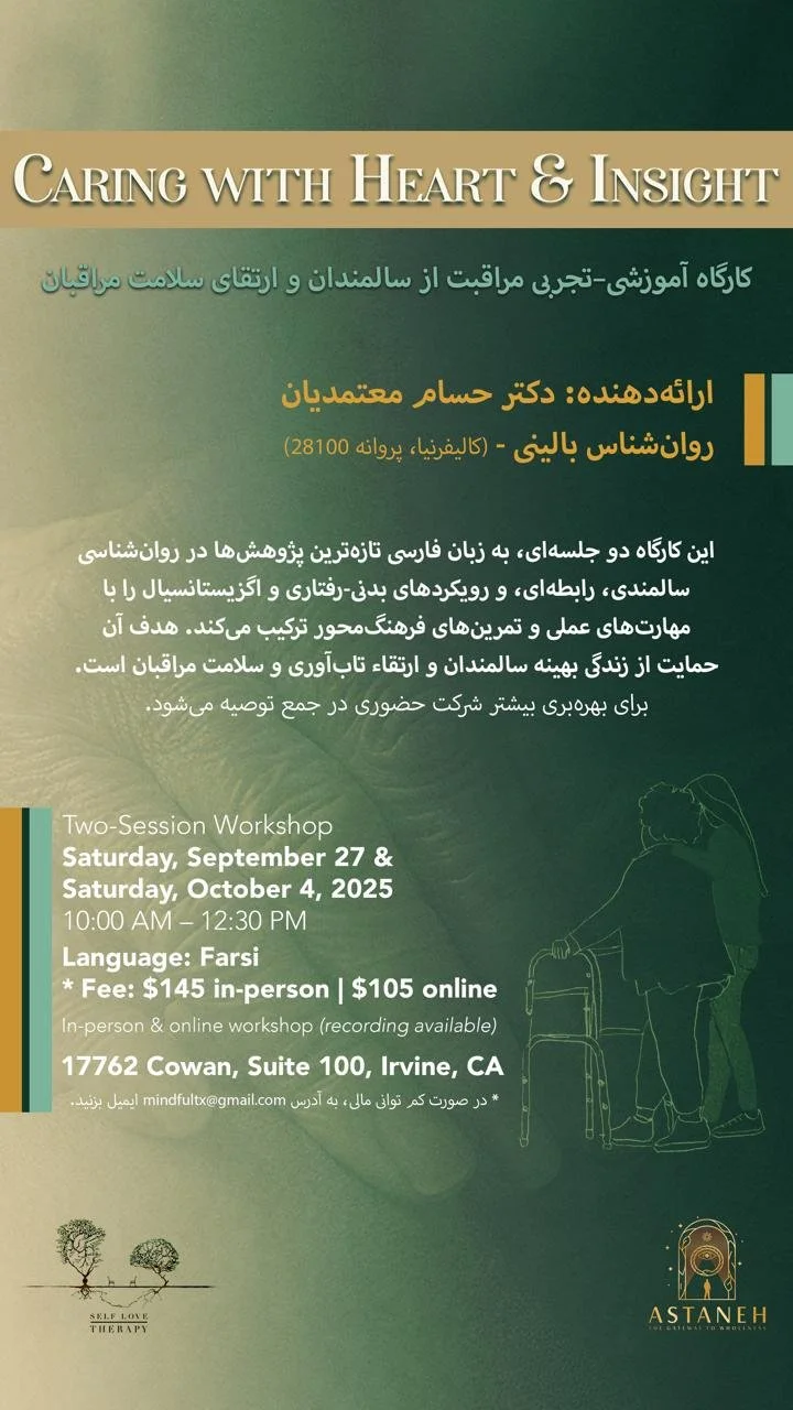 این کارگاه آموزشی–تجربی در دو جلسه و به مدت ۵ ساعت برای مراقبین خانوادگی و حرفهای فارسیزبان که از سالمندان حمایت میکنند طراحی شده است. بر اساس تجربههای زیستهی دکتر حسام در مراقبت از پدرشان، پژوهشهای علمی منتشر شده در روانشناسی سالمندی، سلامت مراقب، روانشناسی رابطهای و اگزیستانسیال، و همچنین رویکردهای حساس به فرهنگ، شرکتکنندگان با موضوعات زیر آشنا میشوند:
